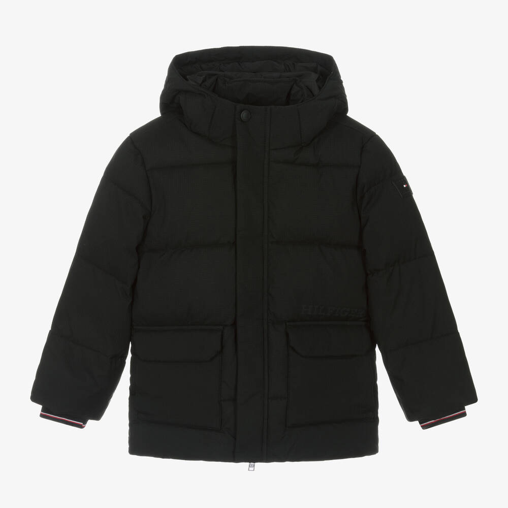 Black puffer jacket for boys by Tommy Hilfiger, made in coated ripstop fabric. Warmly padded and showerproof, this cosy jacket has a removable hood and ribbed cuffs for extra protection from the elements. There are popper fastening flap pockets on the front with additional patch pockets underneath and a tonal logo above. It fastens with a concealed zip and poppers and has subtle branded details on the sleeve, hood and cuffs for a statement finish. This product contains at least 50% recycled fibres.