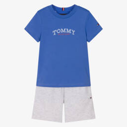 Casual shorts set for boys by Tommy Hilfiger, in bright blue and grey marl. Made in soft cotton jersey, the T-shirt has a collegiate style logo on the front and the brand's signature tricolour trim on the back of the ribbed crew neckline. The coordinating shorts have useful pockets and a drawstring waist, providing a comfortable fit. Both pieces feature the iconic flag logo for a signature finish.