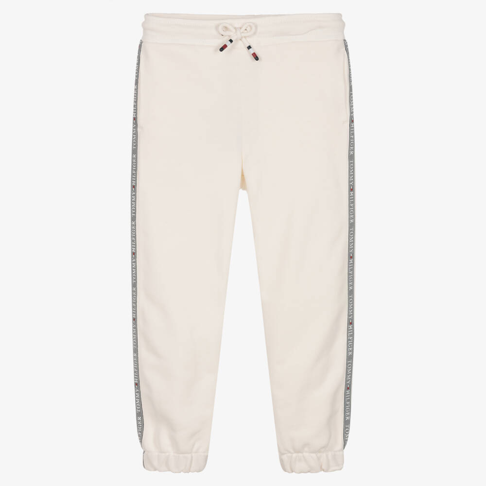 Ivory joggers for boys by Tommy Hilfiger, made from a soft and comfortable cotton jersey, with a breathable looped underside. These cuffed joggers have branded tape piping down the side, with the signature Flag logo on the back pocket for instant designer appeal. Ideal for those relaxed days, they have an adjustable elasticated drawstring waist for a comfortable fit.