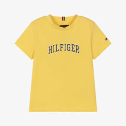 Orange cotton T-shirt for boys by Tommy Hilfiger, with a varsity-style 'Hilfiger' logo printed on the front. Casual and comfortable, this soft jersey tee has a classic crew neckline and a small flag logo embroidered on one sleeve.