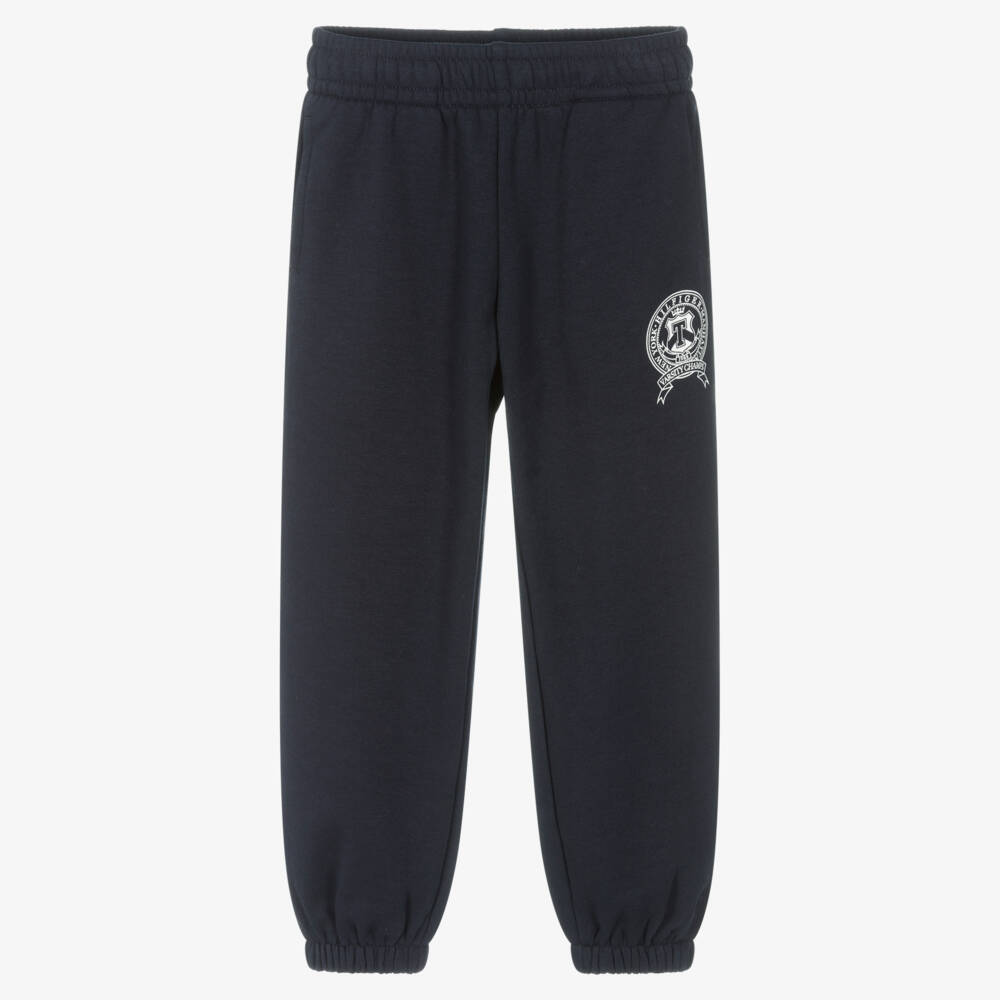 Designed by American brand Tommy Hilfiger, a pair of navy blue cotton-blend joggers for girls. Soft, stretchy and comfortable, they have a white embroidered varsity logo on the front and the signature flag logo embroidered around the back. They have handy side pockets and an internal drawstring on the elasticated waist for a great fit. They are made with at least 50% transitional cotton.