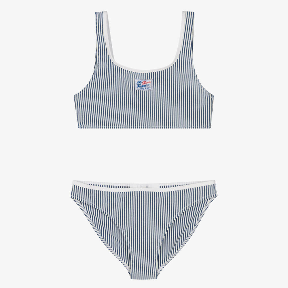 Navy blue and white striped bikini for girls by American brand Tommy Hilfiger. Soft and stretchy, both pieces are trimmed with white binding and lined on the front for comfort. The top has a beach-themed logo label sewn on the front for a subtle designer touch. This product is made with at least 50% recycled polyester.