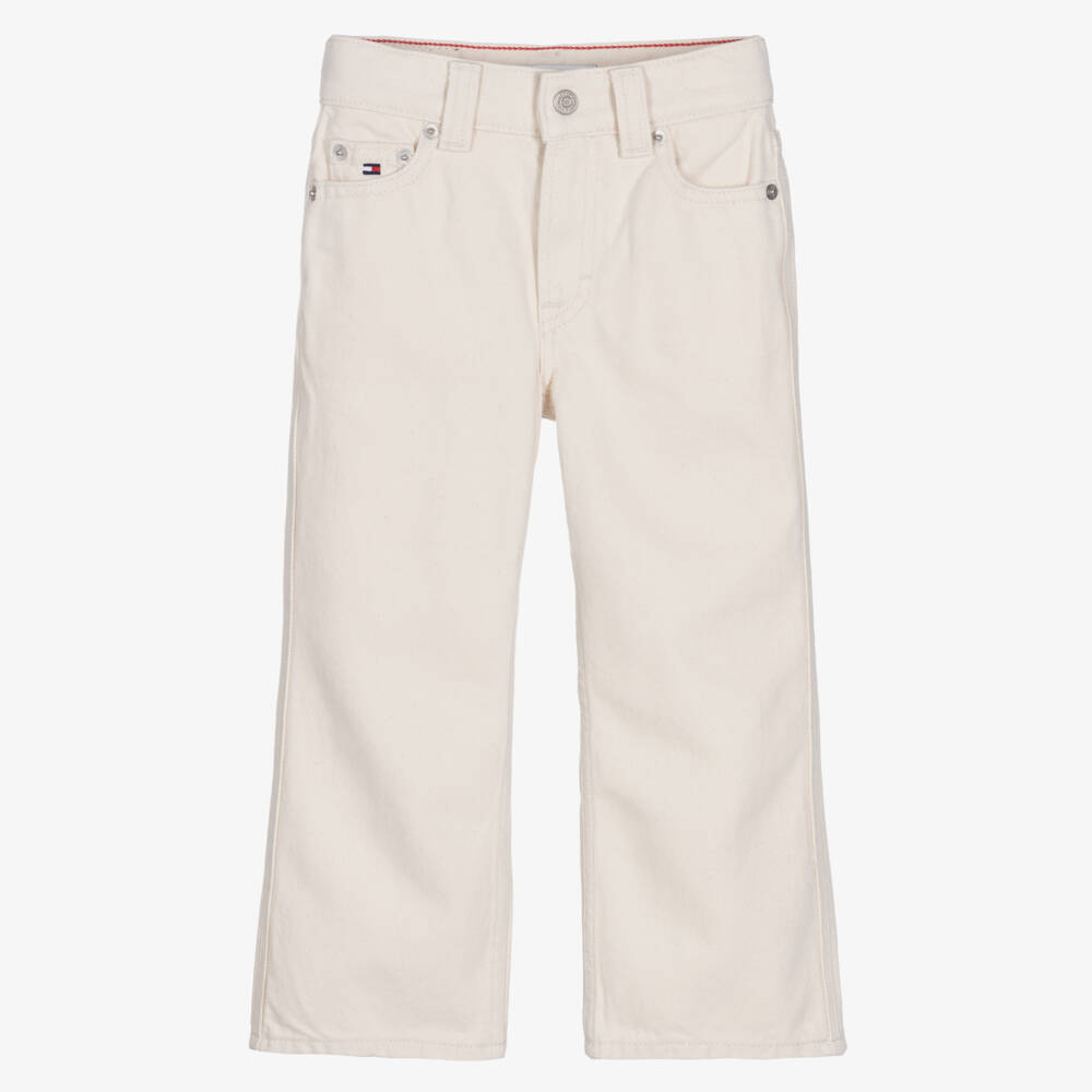 Ecru jeans for girls by American brand Tommy Hilfiger, woven in soft cotton denim with a leather logo patch on the back. Designed for a wide leg fit, these on-trend trousers have distinctive flag logos on the front and back pockets. They also feature branded metal rivets and tonal logo embroidery on the back. The cotton in these trousers is at least 20% recycled.