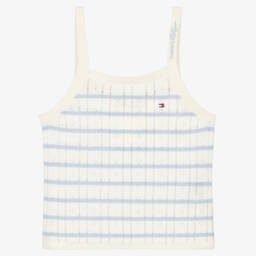 Girls ivory and blue tank top by Tommy Hilfiger, made in a soft cotton knit with a delicate, striped pointelle design. This casual style has a slight stretch for comfort, with embroidered script logos on the straps for instant brand appeal. A little tricolour Flag logo on the front adds a signature finish.