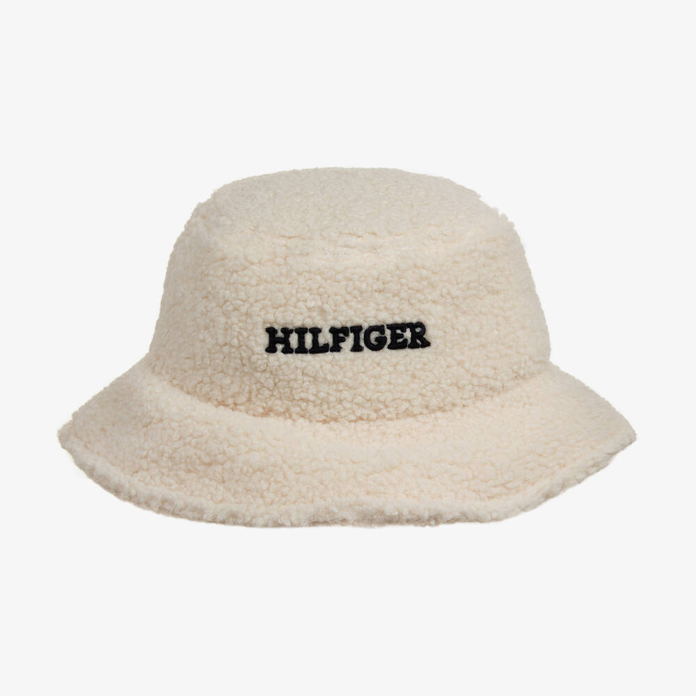 Stylish and cosy ivory bucket hat for girls by American designer Tommy Hilfiger, made in soft teddy fleece. This cool hat has a navy blue monotype logo embroidered on the front.