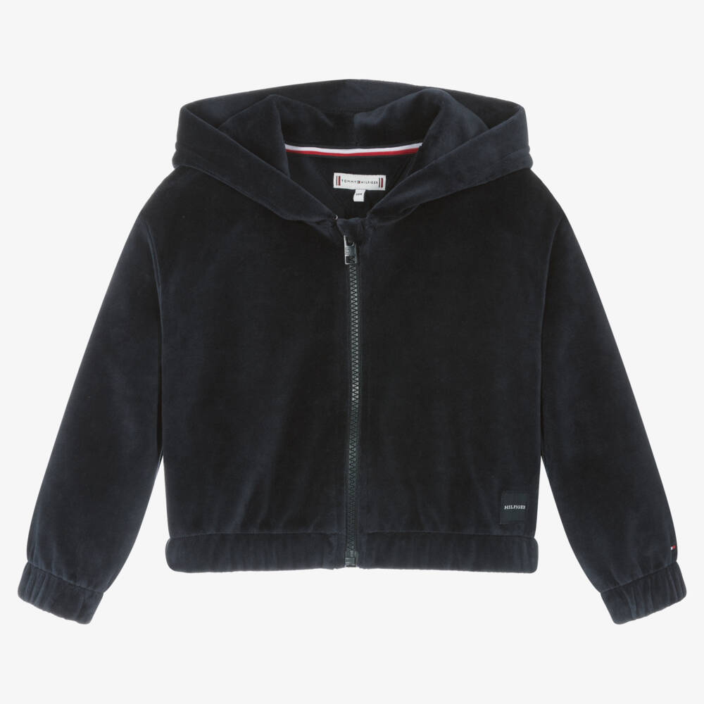 Navy blue cotton zip-up hoodie for girls by Tommy Hilfiger, made from soft, cosy velour. For a designer look, the House's name is tonally embroidered to the edge of the fully lined hood, the iconic flag logo is stitched on one sleeve, and there is a branded patch on the front. The cuffs and hem are elasticated for additional comfort, and there is a small chin guard on the front zip fastening.