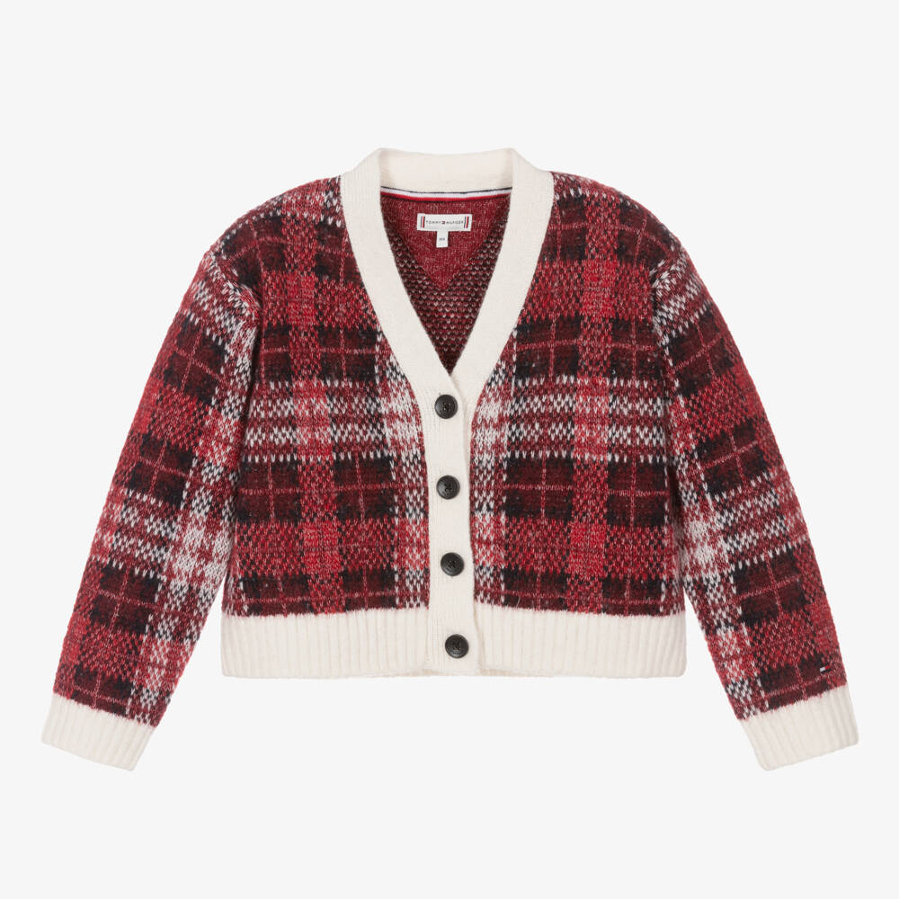Cosy red tartan cardigan for girls by Tommy Hilfiger, made from a beautifully soft, chunky knit. Lovely and warm, this V-neck cardigan has stretchy ribbed, ivory trims and fastens on the front with branded buttons. The brand's signature striped trim features on the inside neckline, with a small flag logo embroidered on one sleeve. This product is made with at least 50% recycled fibres.