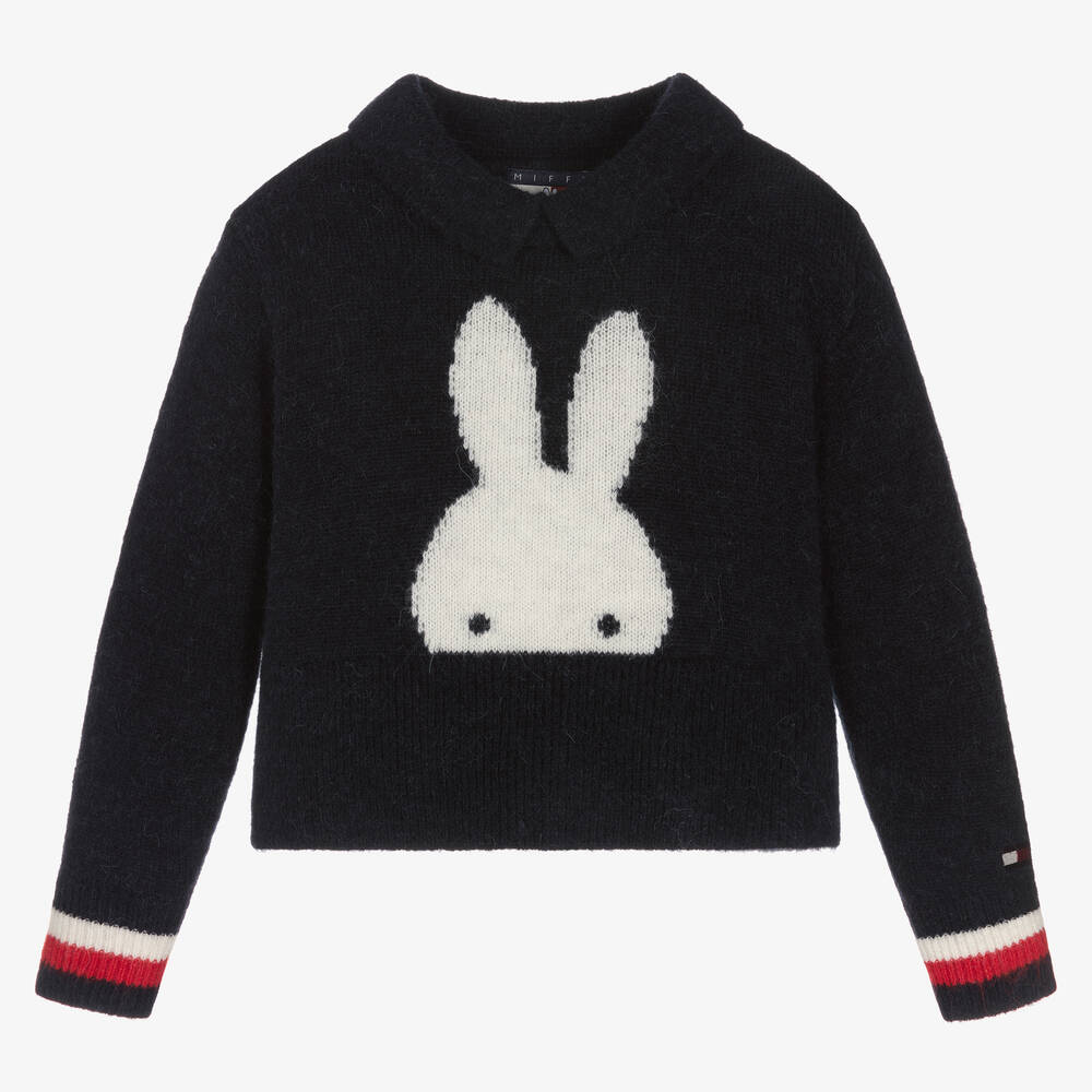 Navy blue boxy-fit sweater for boys and girls by Tommy Hilfiger, inspired by the main collection. In collaboration with Miffy, this cute design has a pointed collar and a white intarsia Miffy motif on the front. Made in a super soft wool and alpaca-blend knit, the ribbed sleeve cuffs are striped in the designer's signature colours of red, white and blue, with an embroidered flag logo detail on one sleeve.