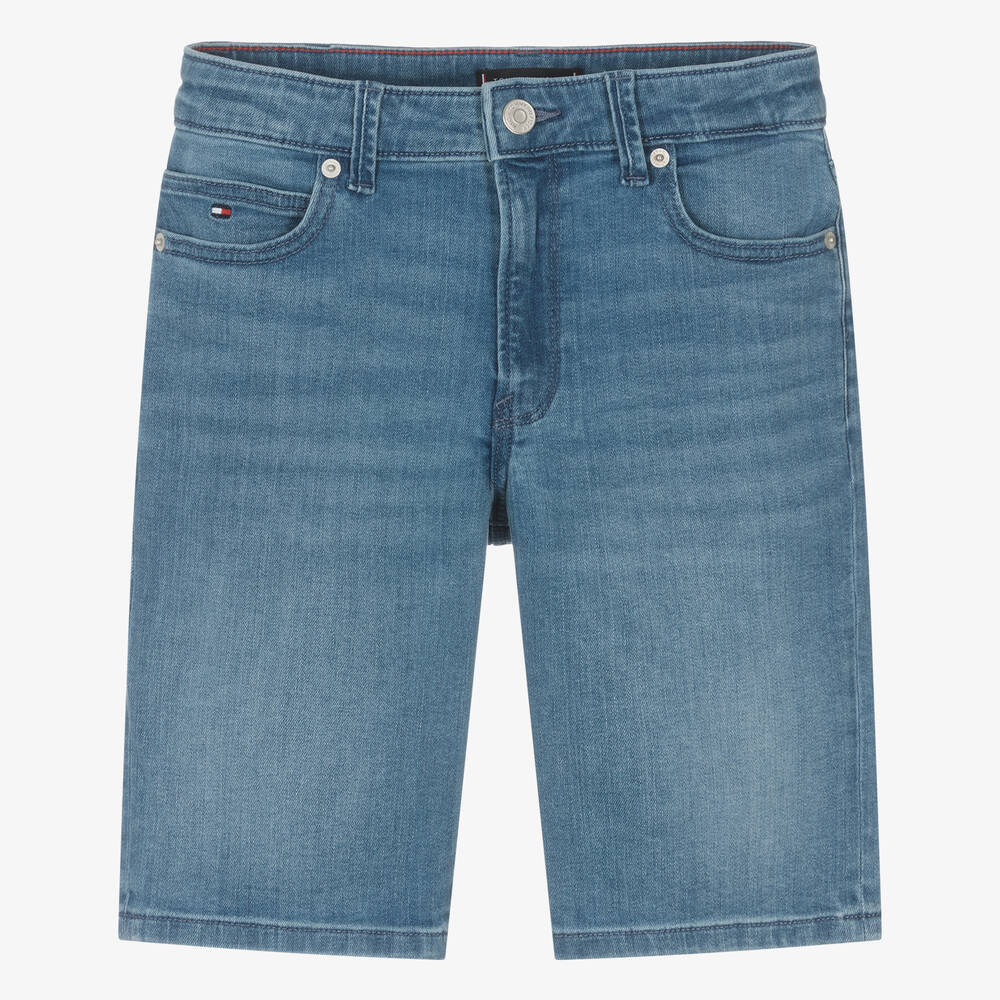 Casual and comfortable for teen boys, these mid-blue wash stretch denim shorts are by American brand Tommy Hilfiger. Button and zip fastening, they have have classic five pocket styling, with rivet detailing on the front and a jacron logo patch on the back. For a signature finish, the designer's distinctive flag logo is embroidered on the front and back. This garment is made with at least 20% recycled cotton.