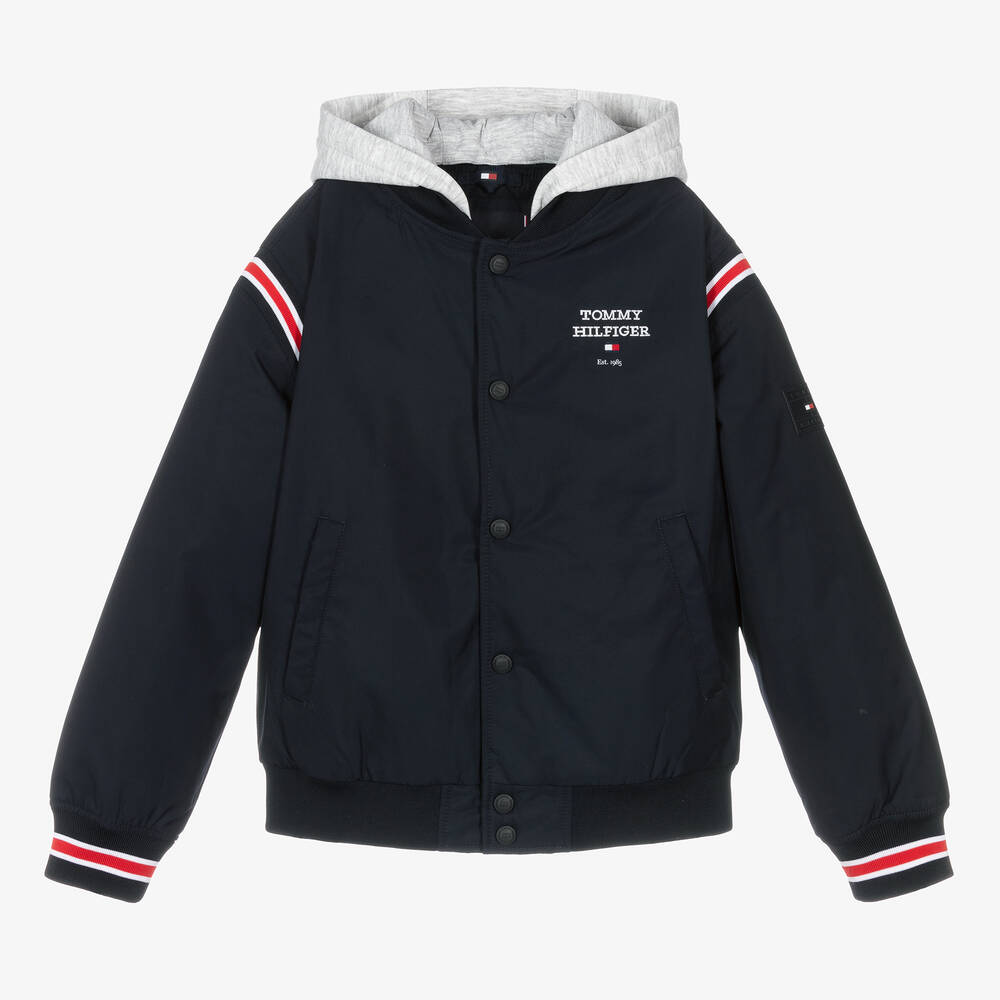 A bomber jacket in navy blue for boys by Tommy Hilfiger. Full of designer appeal, it is designed with stand-out logo embroidery on the chest, branded front poppers, and ribbed trims striped in the American label's famous colour palette of blue, red and white. A double-layer look, this cool jacket has a removable, button-securing jersey hood in contrast grey marl. Made in silky fabric with lightweight, quilted padding, the style is complete with popper-closing front pockets. The outer material and filling are made with at least 95% recycled materials.