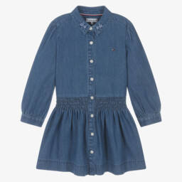 A casual navy blue polo-style dress for teen girls by American designer, Tommy Hilfiger. Stylishly sporty with a feminine twist, it has a small, ribbed collar and unique flutter sleeves. Made in soft organic cotton jacquard jersey in a pretty patterned knit, it is designed in an A-line shape with the brand's signature flag logo embroidered on the chest. It fastens with concealed buttons on the front and there are side seam pockets.