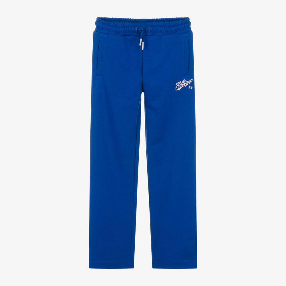 Embroidered with a pale pink script logo on one side, these cobalt blue wide-leg joggers for teen girls are by American brand Tommy Hilfiger. Great for relaxed or active wear, they are made in a soft cotton-blend jersey, with an elasticated drawstring waist for an ideal fit. They have useful front pockets and signature flag embroidery on the back. This product is made with at least 20% recycled cotton.