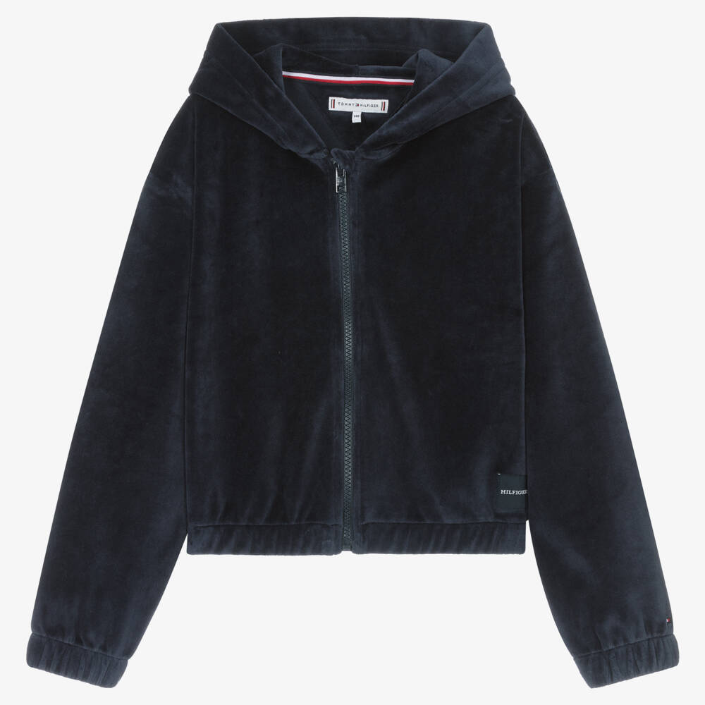 Teen girls can relax in style with this navy blue zip-up hoodie from American brand, Tommy Hilfiger. Made in beautifully soft cotton-blend velour, the discreet designer details include a tonal embroidered logo on the hood, a branded patch on the front and the signature flag logo embroidery on one sleeve. This cosy top is slightly cropped to sit on the waist and is gently elasticated on the cuffs and hem.