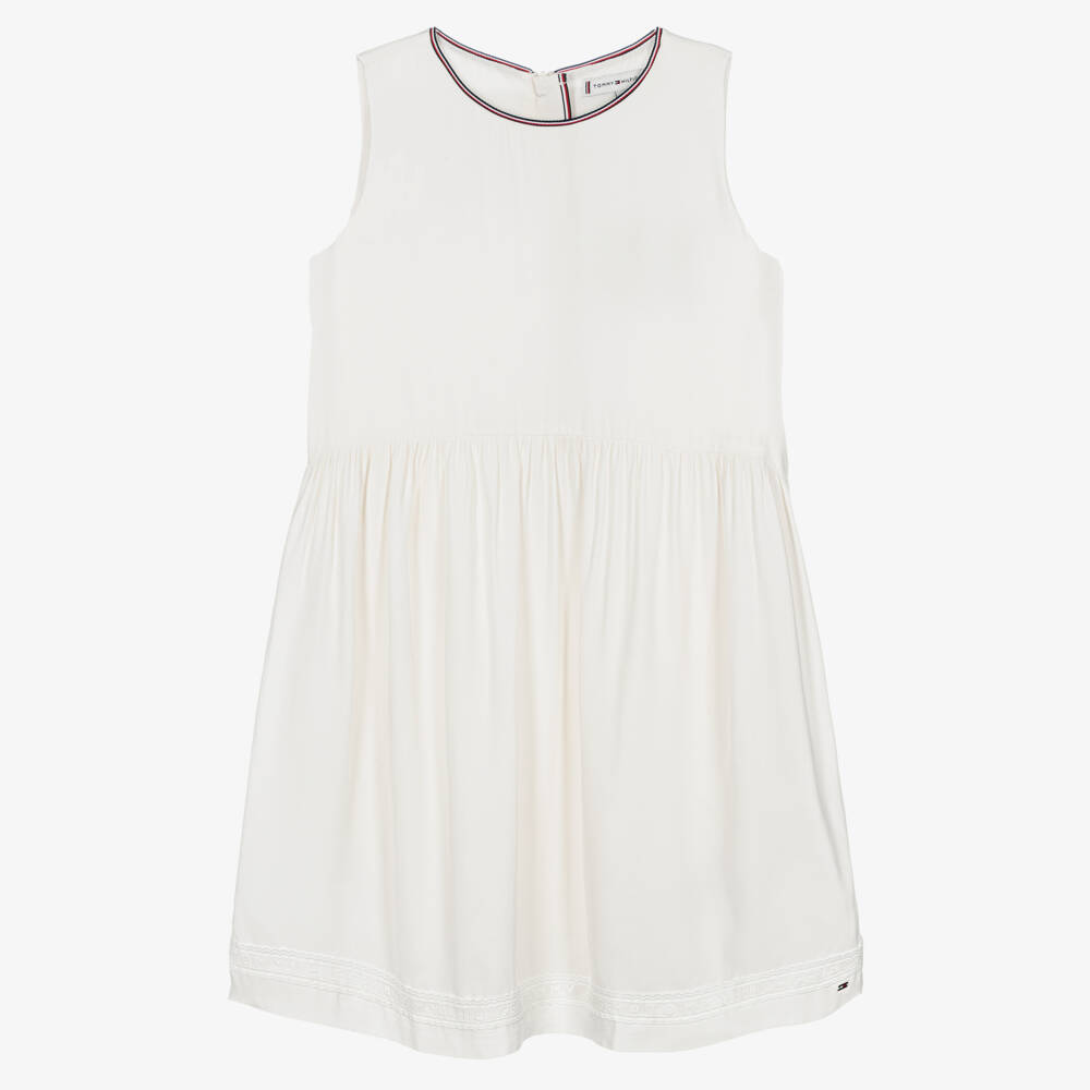 Teen girls white sleeveless dress by Tommy Hilfiger, woven in soft and lightweight crêpe. Decorating the hem is a beautiful tone-on-tone embroidered lace logo detail and silver metal flag branding. The neckline is trimmed with signature tricolour embroidery for a little extra designer appeal. Finishing just above the knee, it has side seam pockets, a comfortable voile lining and a hidden zip fastening on the back. This item contains 50% viscose fibres derived from sustainable wood sources.