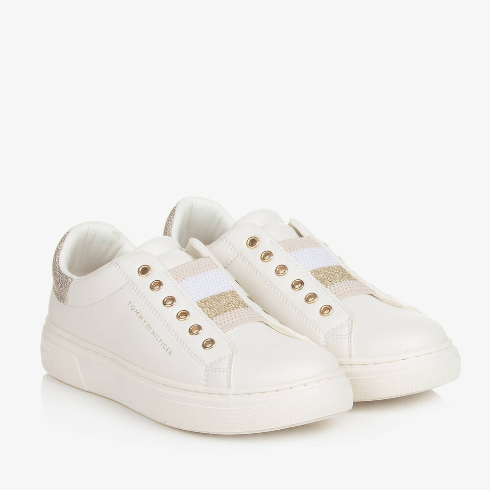 Stylish for teen girls, a pair of white faux leather trainers by Tommy Hilfiger with a gold logo print. Designed with exposed gold eyelets and a glittery elasticated strap, these trainers are an eye-catching option for streetwear days. They have a grained metallic trim on the back and a raised branded design on the rubber midsole. The inside is comfortably padded in jersey and the outsole is non-slip. This item is made using at least 50% recycled materials.