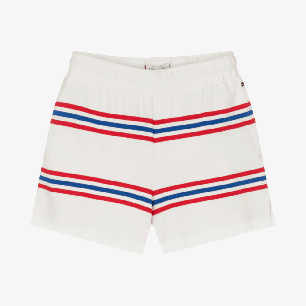 Casual white cotton shorts for teen girls by American brand Tommy Hilfiger, with bold red and blue stripes and the iconic flag logo embroidered on one hip. Made in soft, comfortable jersey, they have an elasticated waist with an internal drawstring for a good fit and useful, concealed side pockets. These shorts are made with at least 95% organic cotton.