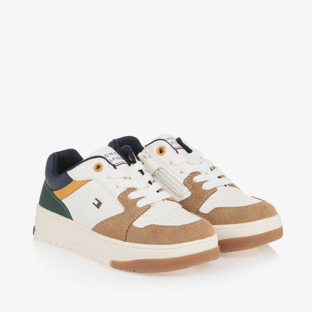 White trainers for boys and girls by Tommy Hilfiger, made in soft faux leather with dark beige, green and navy blue trims. For instant designer appeal, they have the brand's signature flag logo on one side, an embossed logo on the heel and a logo patch on the tongue. They fasten with laces and a zip on the side secured with a velcro tab. They have a soft fabric lining and non-slip rubber outer soles. This product contains at least 50% recycled fibres.