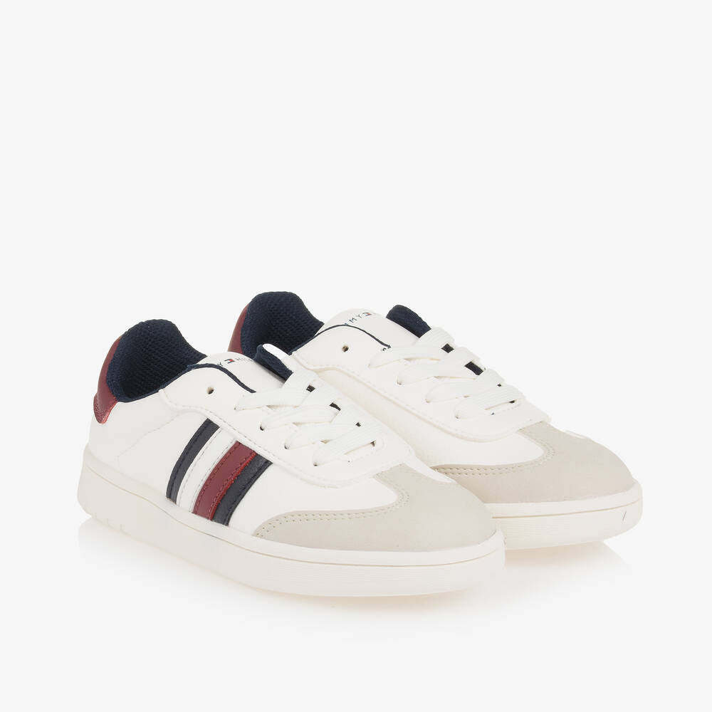 Off-white trainers for boys and girls by Tommy Hilfiger, made in soft grained faux leather. The uppers have a light beige trim on the toes and burgundy red, navy blue and white striped trims on the sides. The brand's iconic flag logo is printed on the back of the heel and there is a discreet logo printed on the tongue. Fastening with laces, they are lined in soft mesh fabric and have a non-slip rubber outer sole.