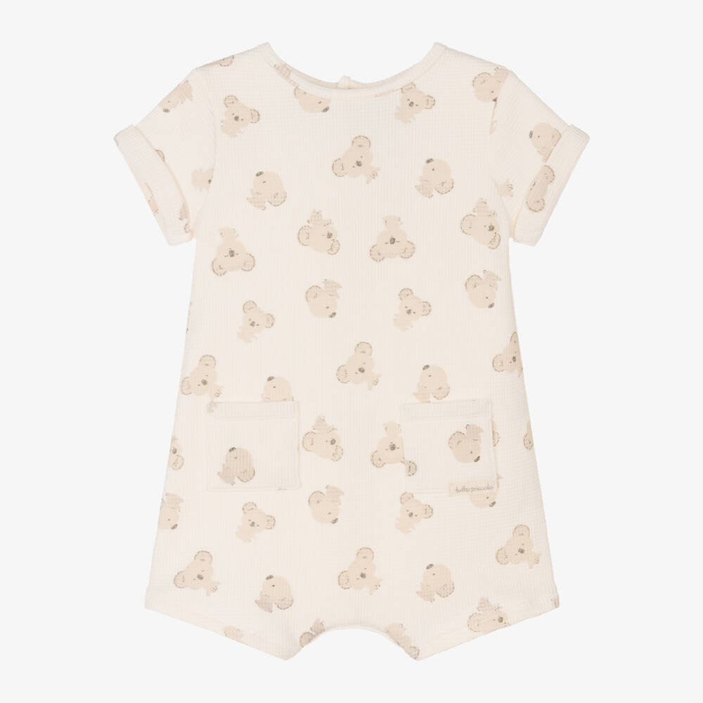 A cute ivory shortie for baby boys by Tutto Piccolo, made in softly textured cotton jersey. It is patterned in a sweet koala print, has two little patch pockets and fixed, turned-up cuffs.