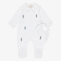 Traditionally styled pale blue cotton shortie set for baby boys by Tutto Piccolo. Made in soft, fine needlecord, the shortie is gently elasticated for comfort, with button-fastening shoulder straps and easy poppers between the legs. The paired jersey top has a matching collar and popper fastenings on the back. A pair of cosy blue socks completes the look.