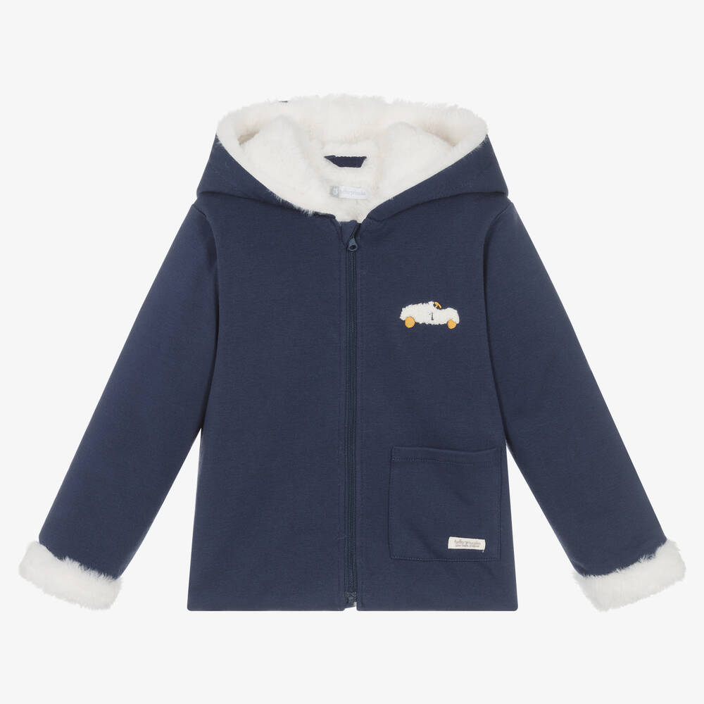 Navy blue hooded jacket for little boys by Tutto Piccolo, made in soft and strtchy cotton jersey. Warm and cosy, it is lined in super soft faux fur. It has a patch pocket on the front and a cute bouclé and embroidered ivory and yellow car motif on the chest. There is a logo tab on the pocket and a zip fastening on the front with a useful chin guard.