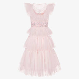 Gorgeous pink dress for baby girls by Tutu du Monde, made in layers of the softest tulle. Ideal for a party or special occasion, it has ruffles on the sheer short sleeves and feathered ruffles on the hem for a dramatic look. Fully lined, it is hand-embellished with pink and white pearls and beads around the neck and has a keyhole button fastening on the back. A pair of matching knickers completes the look. Items are made to last and become more lovely with wear as slight fading and fraying edges adds to their charm.