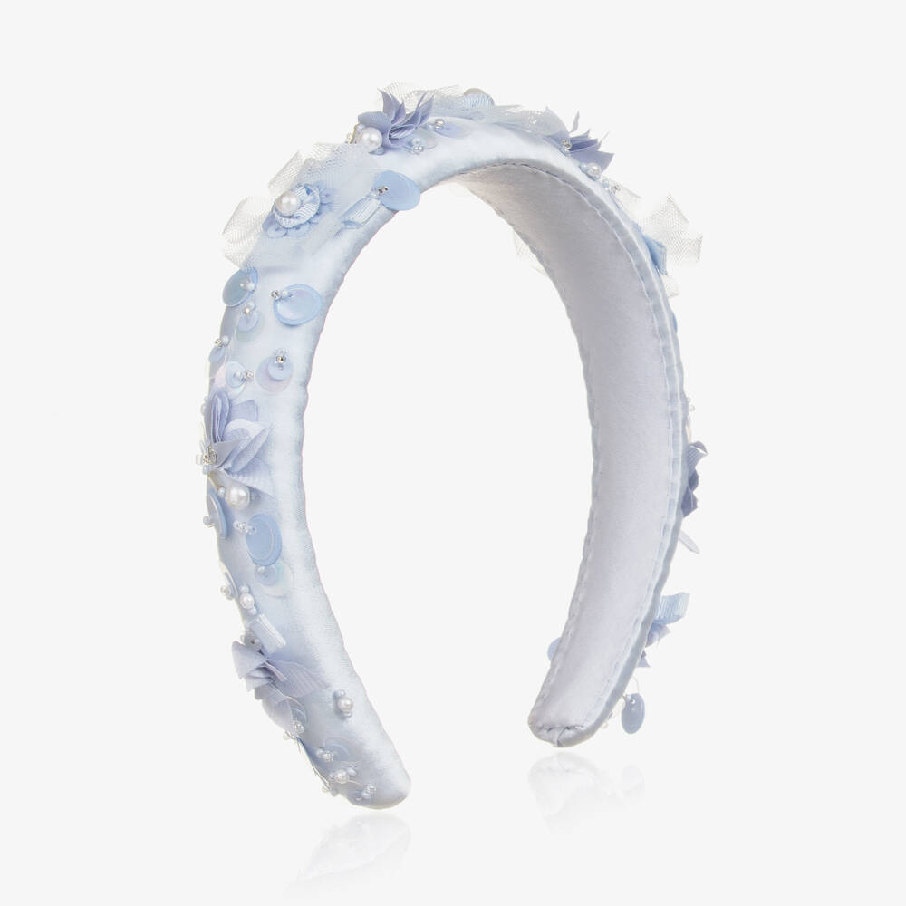 Beautiful light blue hairband for girls by Australian brand Tutu de Monde. This gorgeous accessory has a wide, flexible band covered with padded satin for a comfortable fit. It is decorated with sparkly beads, sequins and faux pearls on the top to look like abstract flowers, with tulle and ribbon trims. Items are made to last and become more lovely with wear as slight fading and fraying edges adds to their charm.
