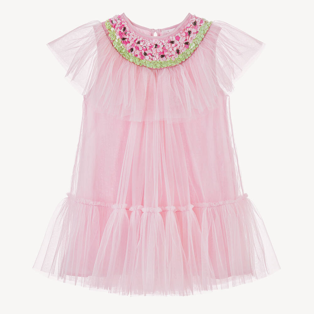 A pink special occasion dress for girls by Tutu du Monde, made from gorgeous voluminous tulle. Ideal as resort wear, it has a pretty watermelon-inspired neckline, hand-embellished in green and pink sequins for a sparkly, tropical bohemian vibe. There is a keyhole button fastening on the back and a delicately soft and comfortable cotton voile lining. Items are made to last and become more lovely with wear as slight fading and fraying edges add to their charm.