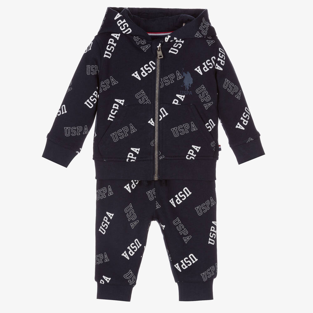 Navy blue tracksuit for baby boys by U.S. Polo Assn., with an all-over white logo pattern. Both pieces are made in soft cotton-blend sweatshirt jersey, with a cosy fleece feel inside. The zip-up hooded top has pouch pockets and the joggers have an elasticated waistband and concealed side pockets.