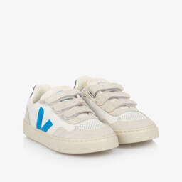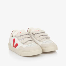 Белые кроссовки V-90 для мальчиков и девочек от VEJA с бежевыми замшевыми вставками. Изготовлены из кожи с органическим прослеживанием. Эти легкие кроссовки имеют фирменный задник и легендарные логотипы 'V' на боках. Они оснащены открытым, мягким язычком и нескользящей подошвой из амазонской резины. Застежки на липучке сочетают стиль с повседневной практичностью.
