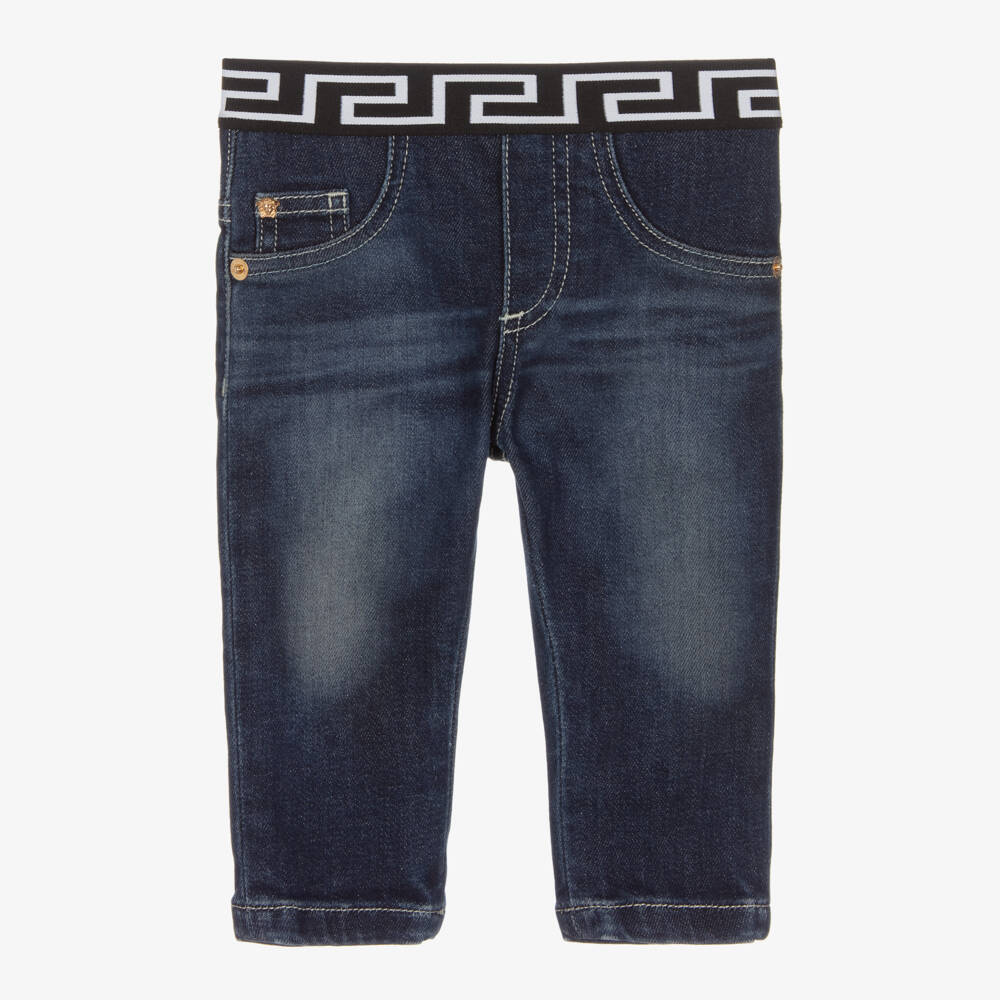 Casual jeans for little boys by luxury brand Versace, made in soft cotton denim, with a slight stretch for comfort. Designed with a five-pocket look, they have two faux pockets on the front and patch pockets on the back. They have a contrast black and white Greca patterned elasticated waistband and are finished with a golden Medusa stud and branded rivets for an unmistakable designer look.