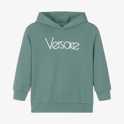 A green cotton hoodie for little boys from Versace, ideal for casual wear with a touch of designer luxury. This wardrobe staple has a white embroidered logo across the chest for instant brand recognition.