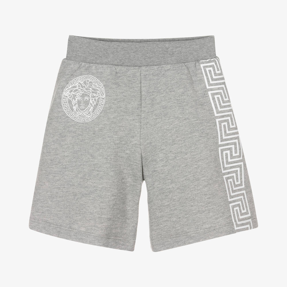 Cool and casual grey marl shorts for boys by luxury designer Versace, made in soft cotton jersey. Iconic Versace logos can be found printed across the style, with the Medusa printed on one leg and the Greca motif printed on the other in white. They have a stretchy elasticated waist for comfort.