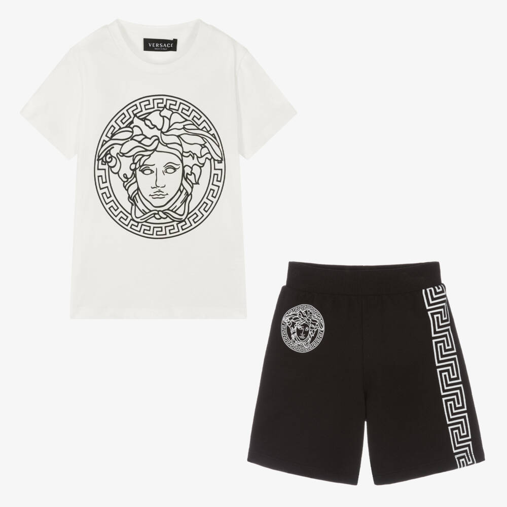 A black and off-white shorts set for boys by luxury Italian brand Versace, made from soft cotton jersey. The designer's iconic Medusa logo is printed alongside the Greca motif in black and white for a distinctive casual look. The T-shirt has a classic crew neck style, and the shorts are finished with a stretchy ribbed waistband.