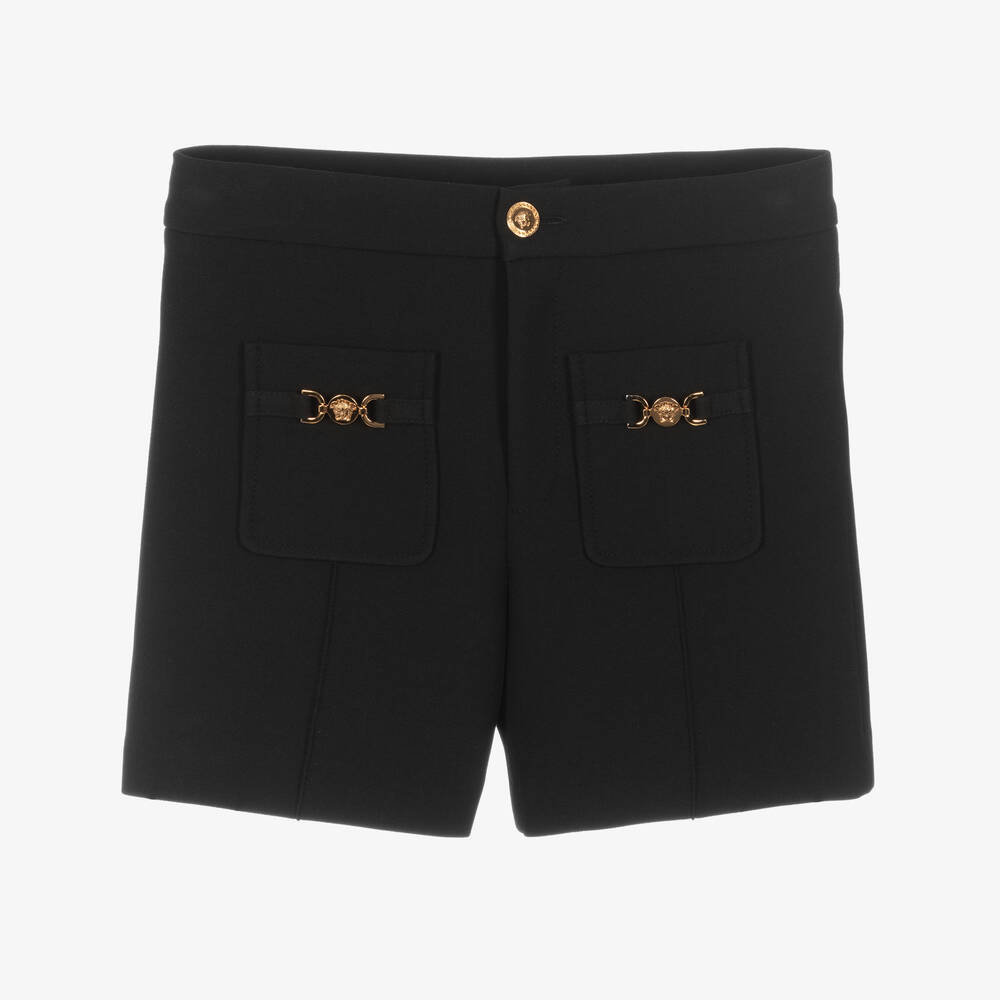 Stylish black shorts for girls by luxury Italian designer Versace, made in a soft, stretchy viscose jersey blend. Adding those signature touches, the front patch pockets are embellished with the brand's iconic gold-tone Medusa hardware. Ideal for those smarter occasions, they fasten with an embossed logo button and zip, with an adjustable waistband ensuring a comfortable fit.