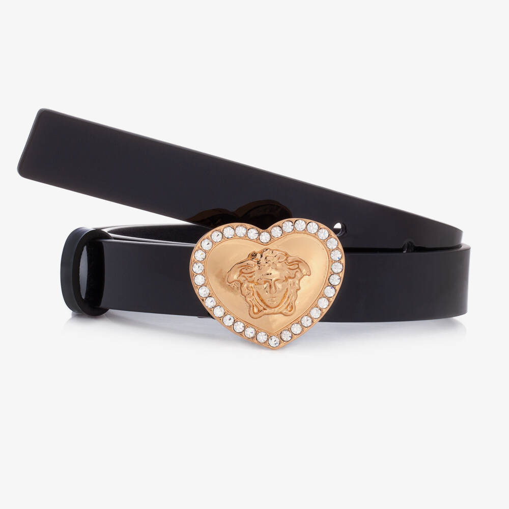This iconic black belt for girls, by Italian brand Versace, is made in a glossy patent leather with a soft grain leather interior. Eye-catching and alluring, this belt has an adjustable gold heart-shaped buckle fastening, with the brand's signature Medusa logo and sparkling diamanté trims.