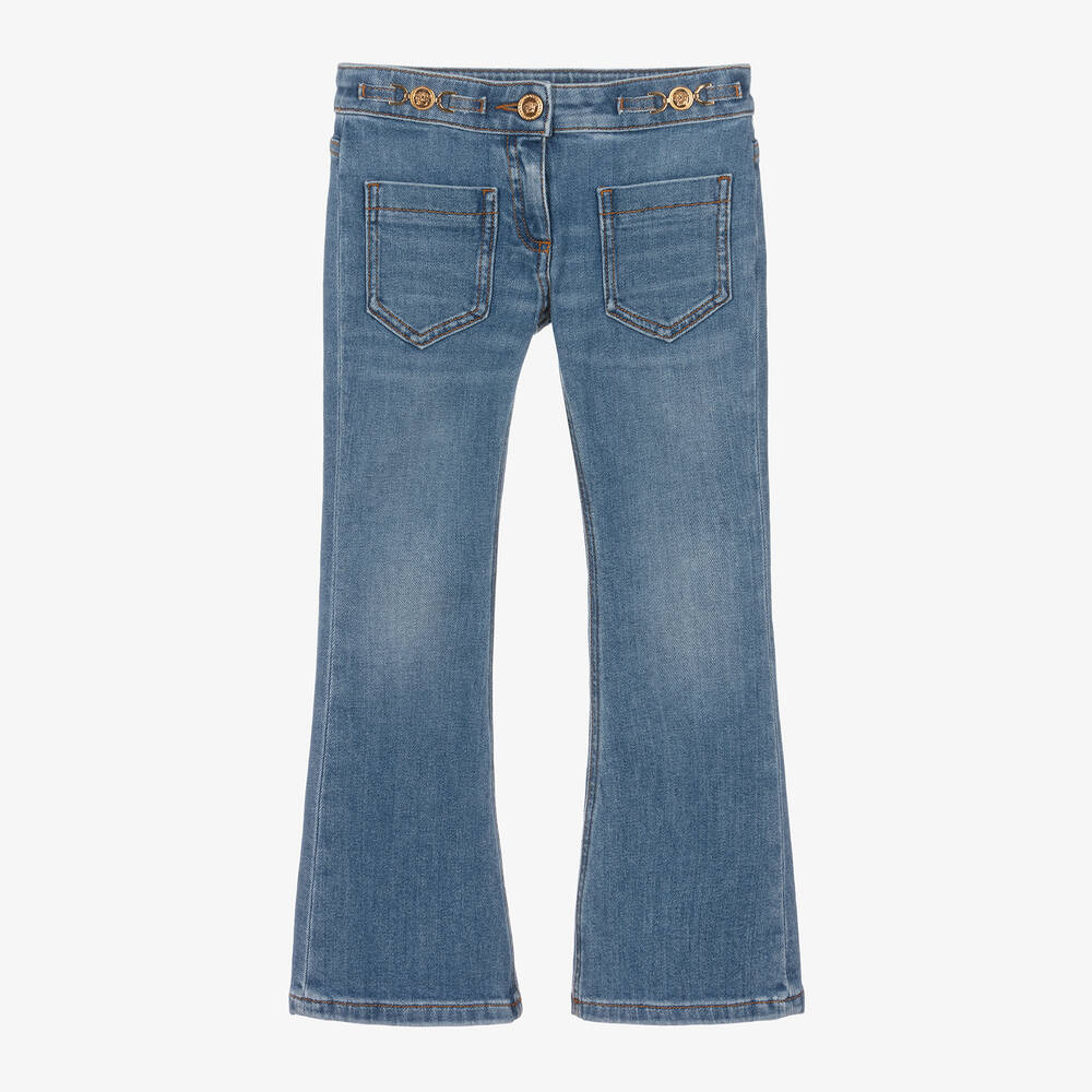In a mid-blue wash, these denim jeans for girls are by luxury Italian brand Versace. They are styled with a modern flared leg and have patch pockets on the front. Decorative gold-tone Medusa metalwork adds that signature touch, with a matching embossed button and zip fastening completing the designer look. To ensure a comfortable fit, the waistband can be easily adjusted.