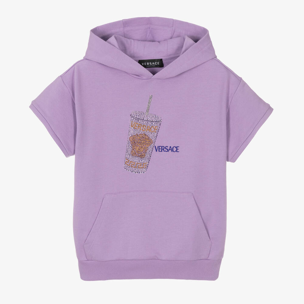 Gorgeous lilac purple hoodie for girls by luxury Italian brand Versace, with a sparkling diamanté cup and the iconic Medusa logo. Made in soft and comfortable cotton jersey, this short-sleeved sweatshirt has ribbed trims and a large pocket on the front.