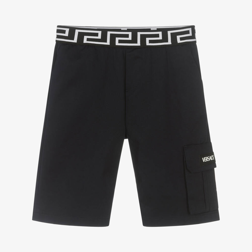Navy blue Bermuda shorts for teen boys by luxury Italian designer Versace, made in lightweight twill. Unmistakeably Versace, these contemporary shorts have a black and white elasticated waistband with the brand's signature Greca border. The style features multiple pockets with a rubberised logo badge on one leg for an added designer detail.
