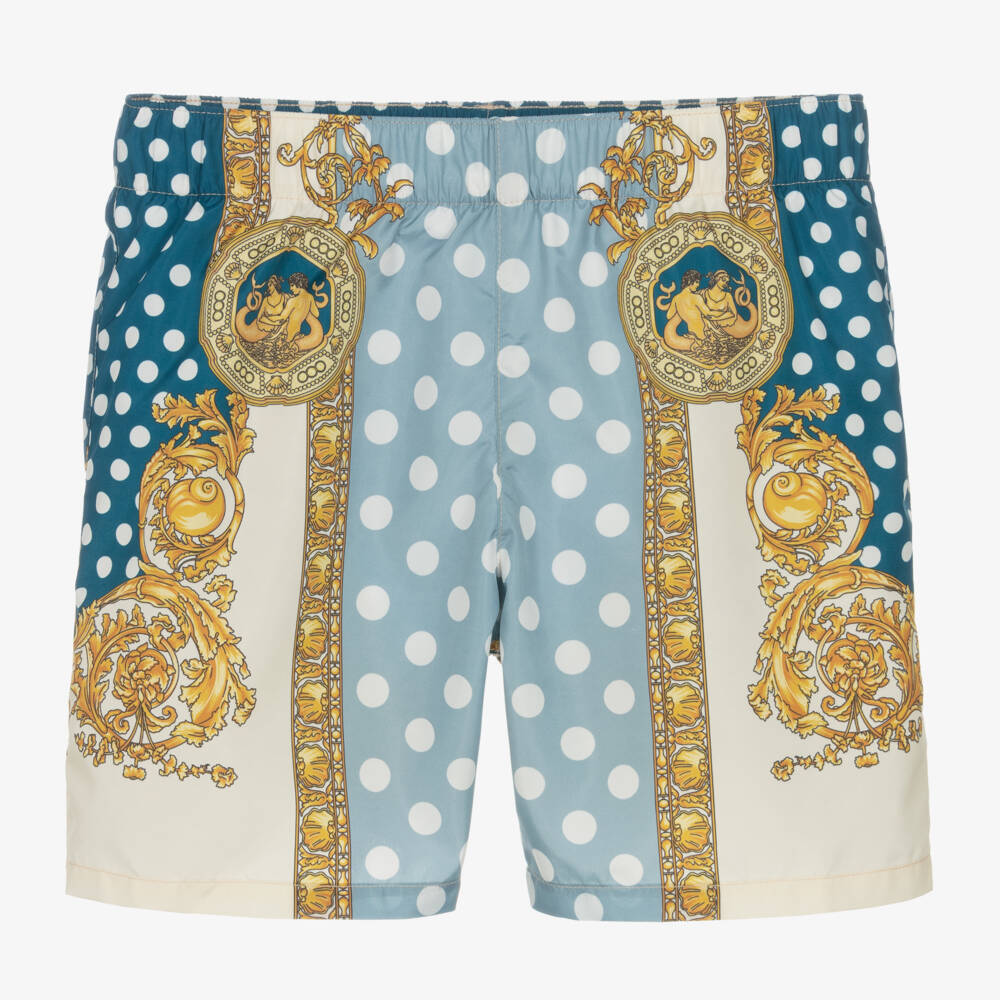 Blue, ivory and gold swim shorts for teen boys by luxury Italian brand Versace. They are patterned with white polka dots and the brand's distinctive, eye-catching gold Seashell Baroque print featuring seashells and mermaids. Lightweight, with an elasticated waistband and a patch pocket on the back, they are made in silky smooth fabric with a breathable mesh lining for comfort.