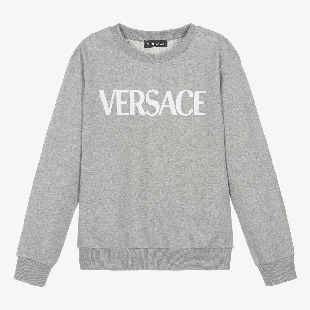Casual grey sweatshirt for teen boys by luxury Italian brand Versace. Making a designer statement, it features a bold white logo print across the front, with the iconic Medusa motif on the back. Soft and comfortable, it is made in mid-weight cotton jersey with ribbed trims for a cosy feel.