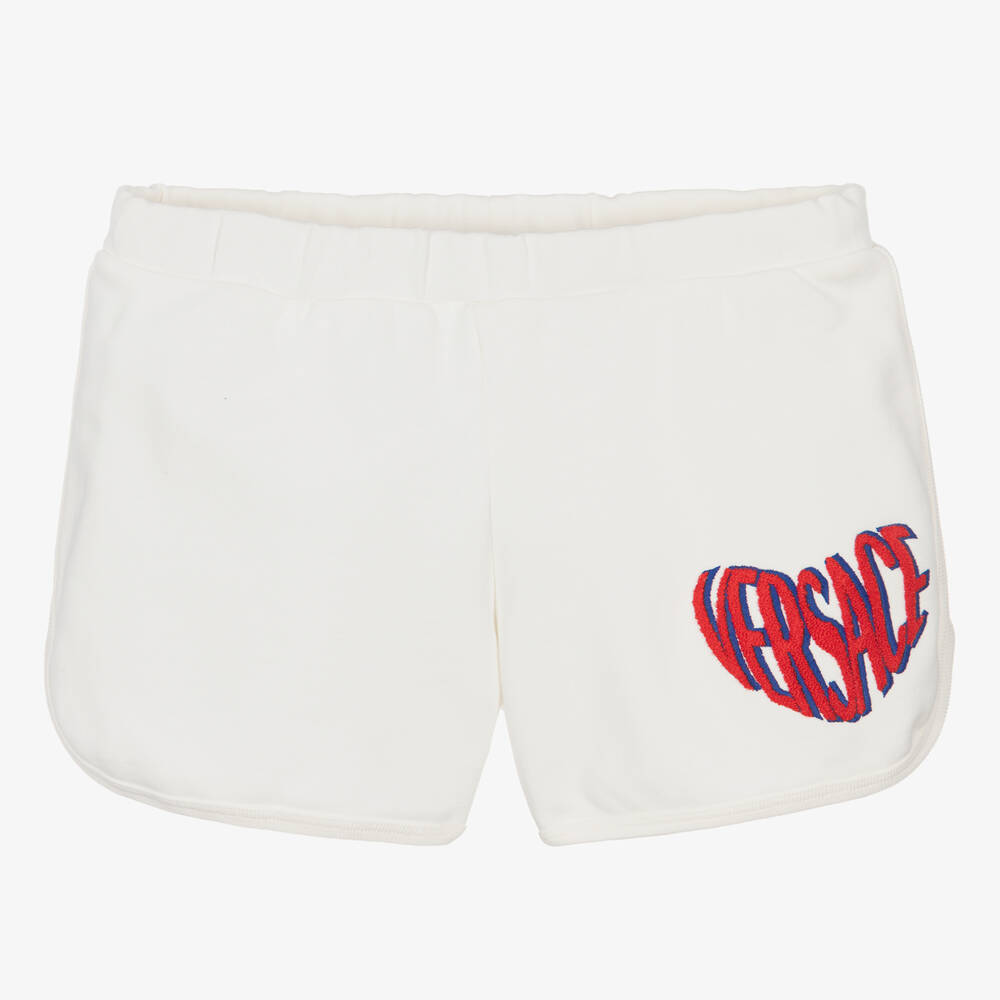Teen girls ivory shorts by luxury fashion house, Versace. Ideal for casual days, they have the brand's playful red heart logo embroidered on one leg for a love-inspired look. Made in soft cotton jersey, they promise comfort and cool styling.