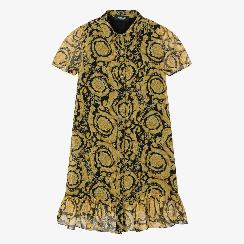 From Italian designer Versace, this black and gold shirt dress is designed for teen girls. Lightweight with a delicate feel, this signature piece is made from luxurious silk chiffon and patterned with the opulent Barocco print. It is styled with a pointed collar, a ruffled hemline and sheer short sleeves that lightly gather on the shoulder. Medusa accents can be seen on the gold-tone buttons, adding an iconic house code and the silk-blend lining ensures a smooth feel against the skin.