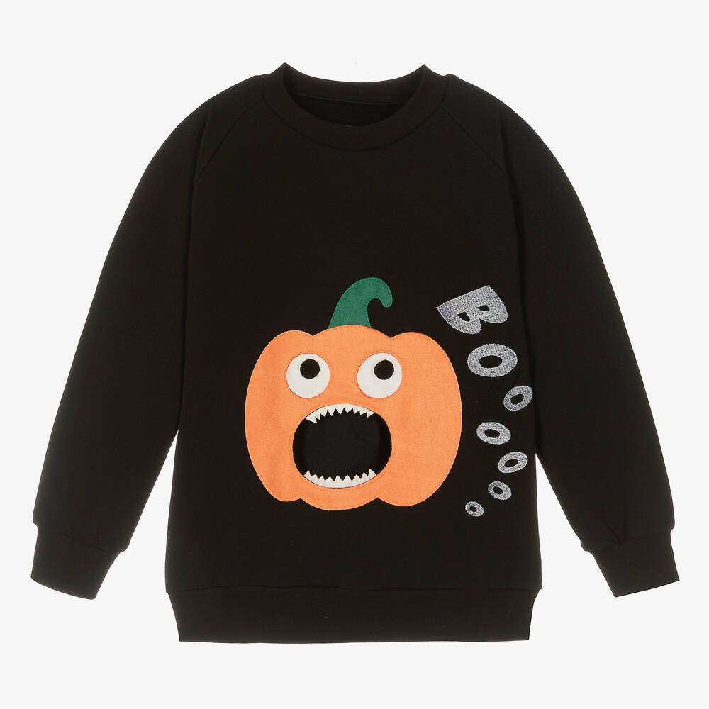 Black sweatshirt for boys and girls by Wauw Capow, made in super soft, medium-weight jersey. Fun and full of character, this organic cotton layer has an orange pumpkin appliqué on the front, which is designed as a secret pocket for their small essentials. Cosy and comfortable, it has a fleece-feel underside and 'Boo' embroidered on the front for a spooky vibe.