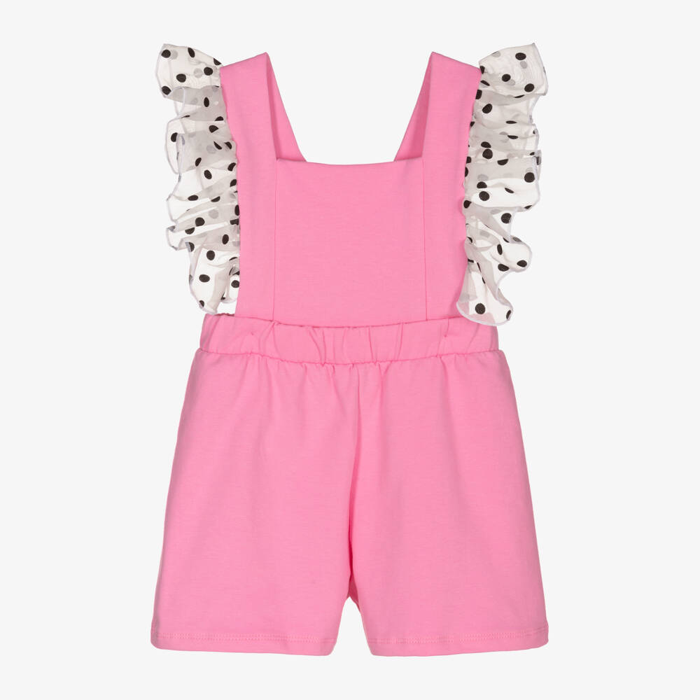 Fun pink 2-in-1 playsuit for girls from Wauw Capow by Bangbang. Made in soft and stretchy organic cotton jersey with a fleecy interior, the adjustble strap has pretty white and black polka dot organza frill trims. Versatile and comfortable, the removable top half secures with buttons so the shorts can be worn separately.