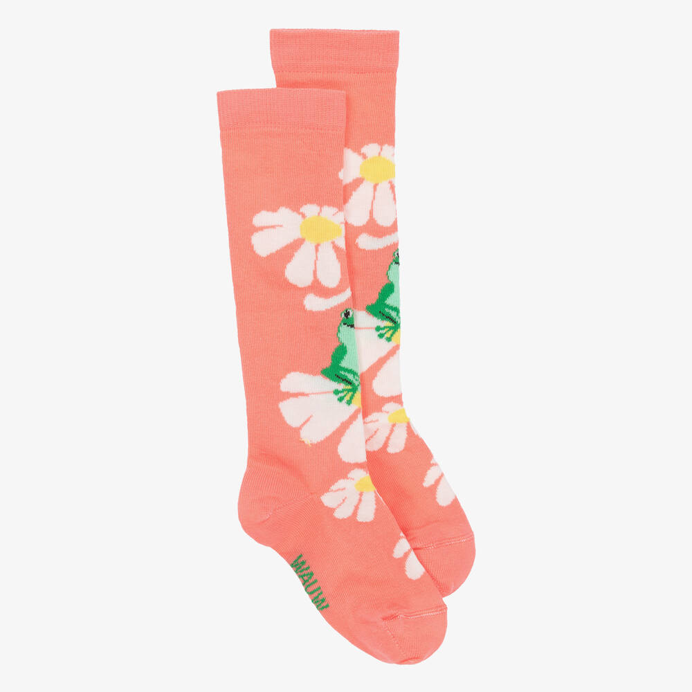 Coral pink, knee-length socks for girls by Wauw Capow by Bangbang. They have a quirky frog and daisy design on the front, with the brand's logo on the sole, for a subtle designer touch. Super comfy to wear, these soft and stretchy socks add a playful touch to any outfit.