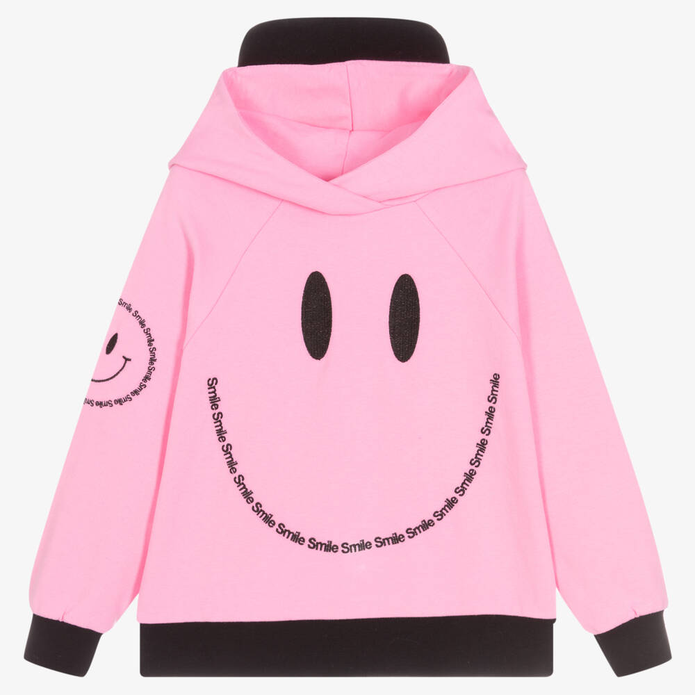 Pink hoodie for girls from Wauw Capow by Bangbang. Made with stretchy, mid-weight organic cotton jersey, happy face embroidery decorates the front and one raglan sleeve, with 'Smile' lettering. The ribbed hem and cuffs are in contrast black, with a black cap-style peak on the hood.