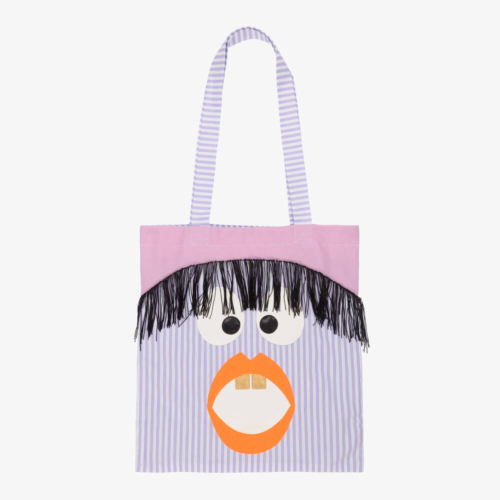 Lilac purple and white striped tote bag for girls from Wauw Capow by Bangbang. Made in soft fabric, it has a fun character face appliqué with a neon orange and gold mouth, large eyes, and black fringing as hair.