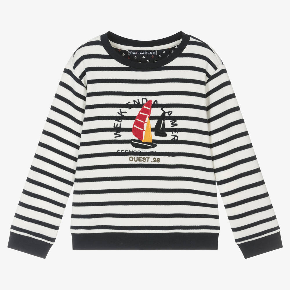 Lightweight sweatshirt for boys by Week-end à la mer, in the French brand's signature Breton Stripes. Made in soft cotton jersey, it features a nautical logo design on the front, with appliqué yachts in red, yellow and blue. To complete the look, it has navy blue ribbed trims and smaller sizes fasten with poppers on one shoulder to help with dressing.