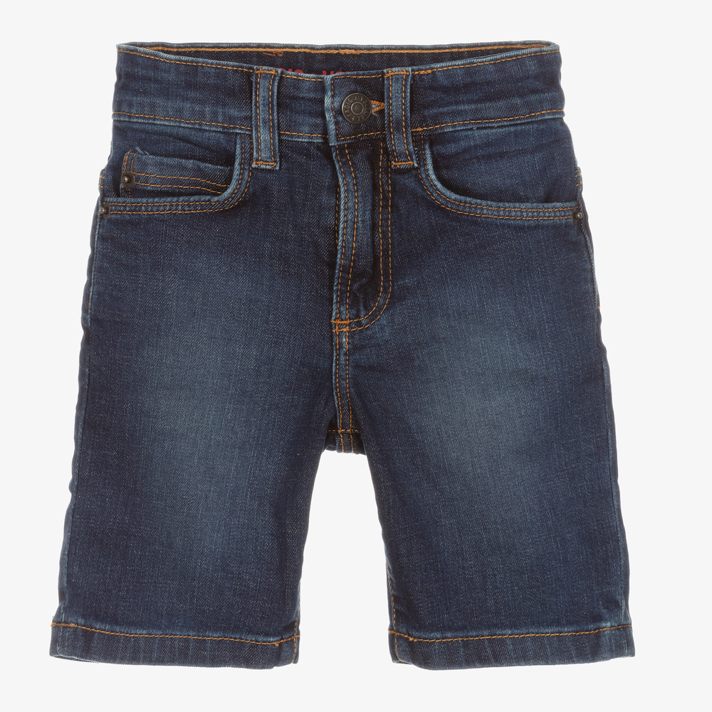Darker blue denim shorts for boys by Zadig & Voltaire Kids, in a traditional five pocket style. They has a useful adjustable waist and fasten easily with a zip and button. There is a tan brown logo patch on the back and embroidery on one back pocket.